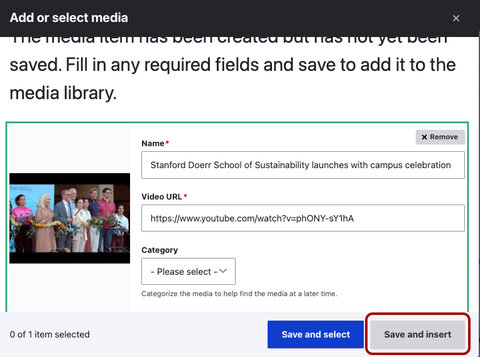 Click Save and insert. (Saves to the media library and adds the video to your page.)